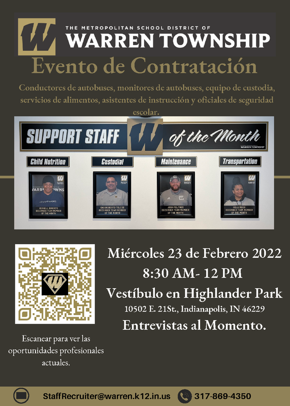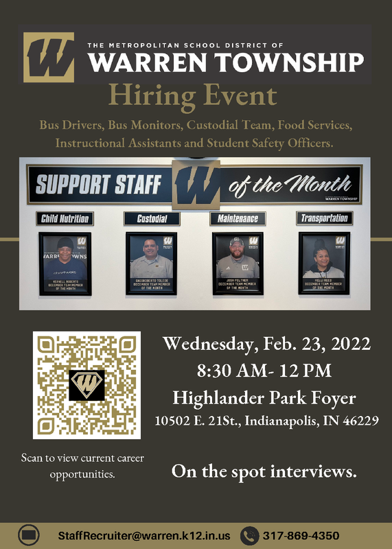 MSD Warren Township will be hosting a hiring event next Wednesday, February 23, 2022, from 8:30 a.m. - 12 p.m. The event is being held at Highlander Park, located at 10502 E. 21st Street. Our transportation team, custodial team, food services team, school police team, as well as our District team, will be onsite for interviews. Please see the flyer below for more details. If you are not able to attend but are interested in joining the Warren team, please visit our Human Resources page on our District website for available positions.